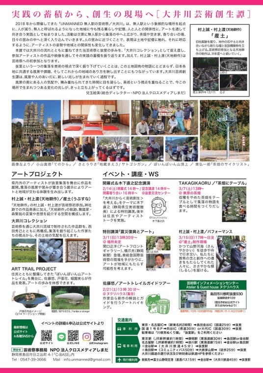 NPO法人クロスメディアしまだ(静岡県島田市)は、2018年より継続してきた「UNMANNED 無人駅の芸術祭/大井川」の実践を継承・発展させる第一弾として、地域の暮らしと記憶を深くあらわす地域芸術祭「大井川芸術創生譚(そうせいたん)」を、2026年2月14日(土)から3月15日(日)まで、島田市川根町抜里地区を中心に開催します。
