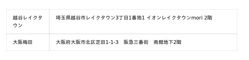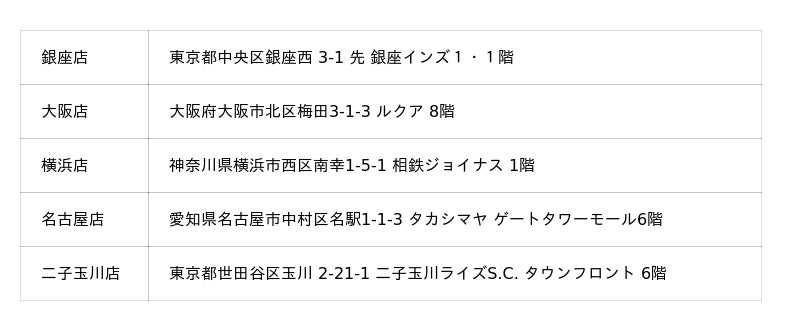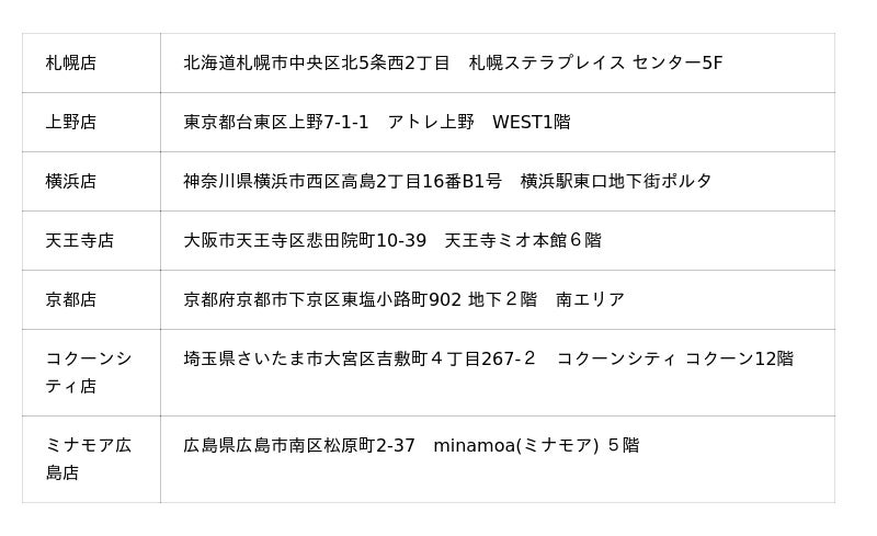 (札幌店、上野店、横浜店、天王寺店、京都店、コクーンシティ店、ミナモア広島店)