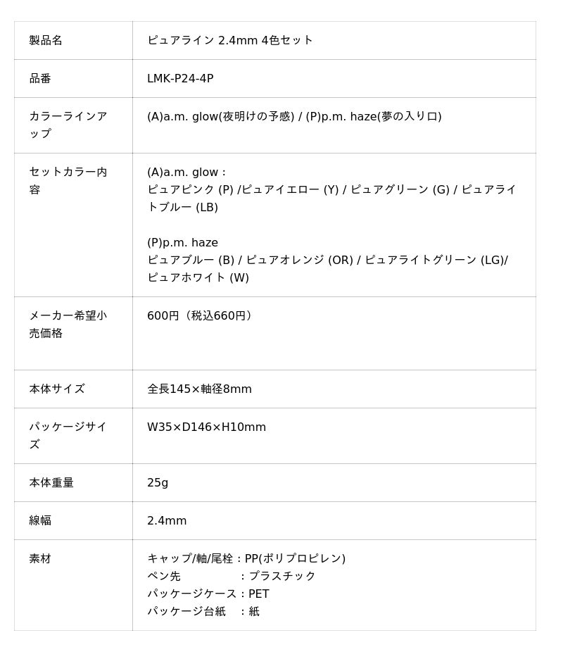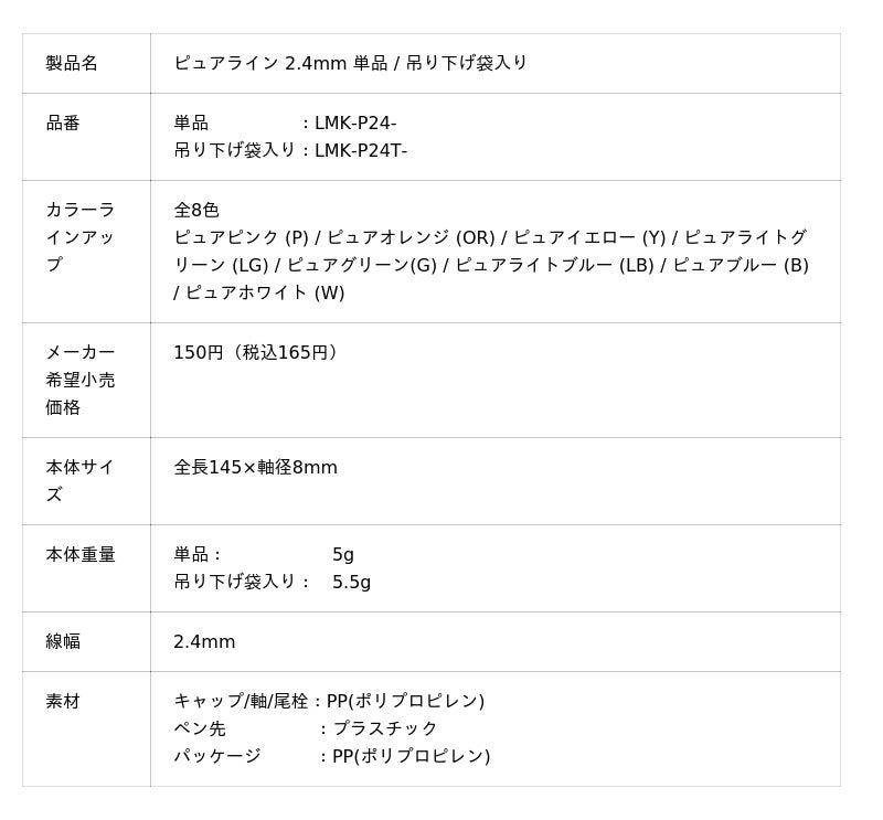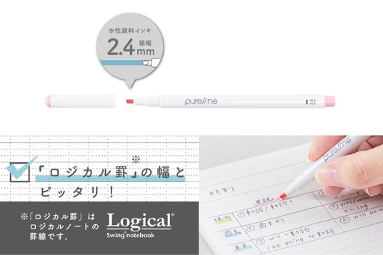 スリムなペン幅でロジカル罫にぴったりピュアラインはスリムな線幅のラインマーカーです。一般的なラインマーカーの線幅が4mmに対して本製品は2.4mmと細く、ペンケースに収納してもかさ張りにくく持ち運びに便利です。
