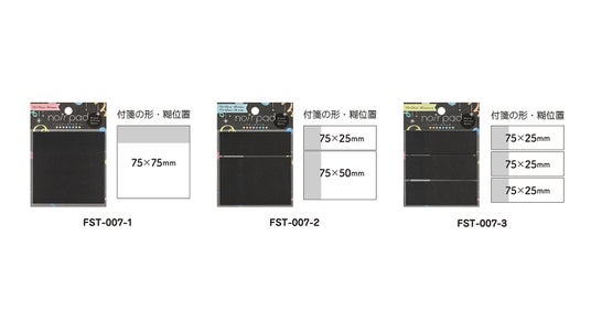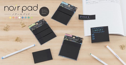 ノアールパッドは色上質紙の黒い用紙の付箋なので裏面まで黒く、ノートに貼ったときにも目を引くアイテムです。75×75mmの1ピース、75×50mmと75×25mm2サイズで使い分けできる2ピース、25×25mmと細長いサイズでたっぷり90枚の3ピースの3サイズを展開。用途に合わせて使い分けが可能です。