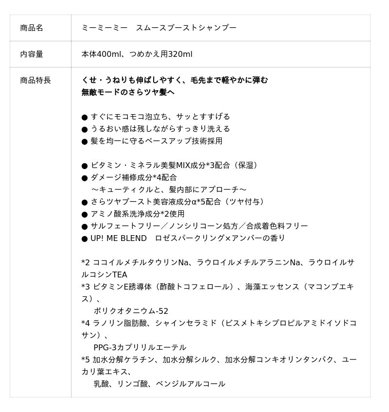 『ミーミーミー スムースブーストシャンプー』と『ミーミーミー スムースブーストトリートメント』は、くせ・うねりも伸ばしやすく、毛先まで軽やかに弾むさらツヤ髪へと導きます。