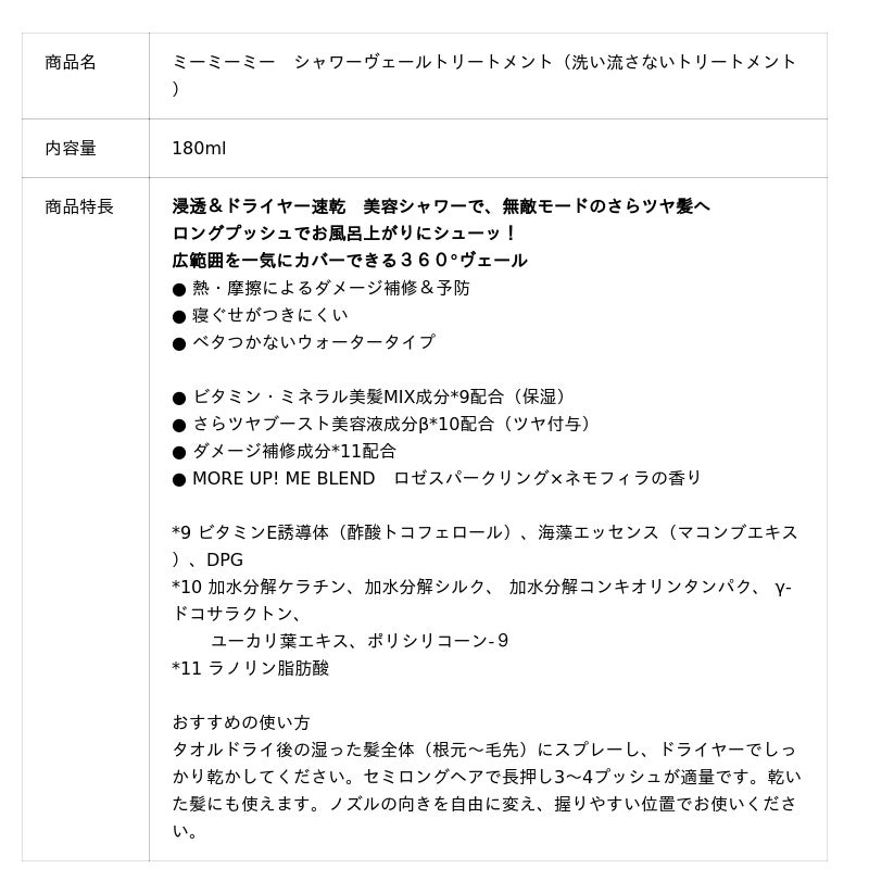 『ミーミーミー シャワーヴェールトリートメント』は、髪の1本1本を均一にコートすることでさらさらの指通りが持続し、翌朝も扱いやすい髪へと導きます。さらに、ロングプッシュスプレーを採用し、ワンプッシュでお風呂上りの髪全体にムラなく一気に塗布できます。