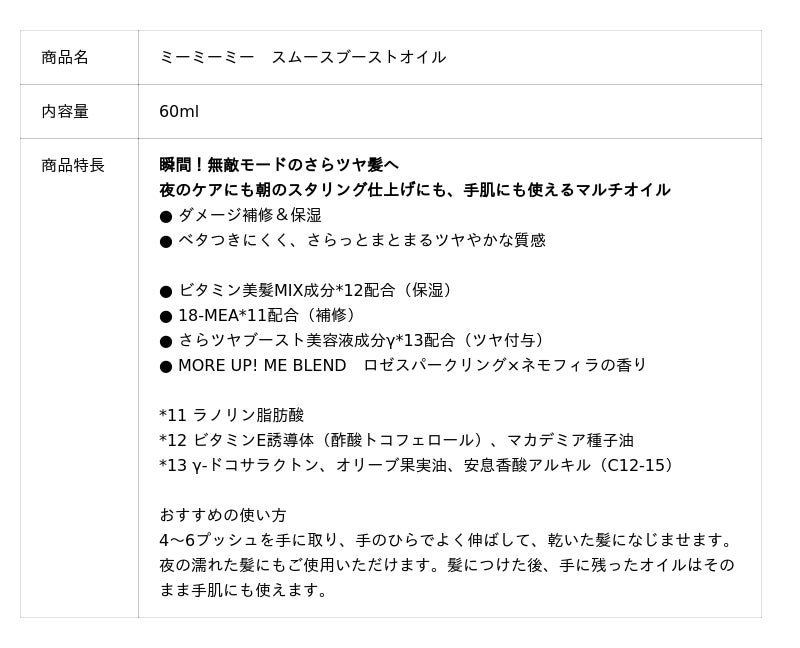 『ミーミーミー スムースブーストオイル』は、夜のケアや朝のスタイリングの仕上げ、手肌にも使えるマルチオイルです。液状のオイルを髪に塗布すると、揮発成分が蒸発した後に残るゲル状の膜がベタつかず、さらっとまとまるツヤ髪に導きます。