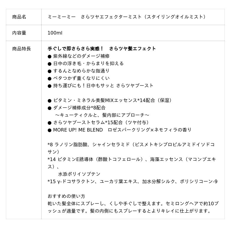 『ミーミーミー さらツヤエフェクターミスト』は、つけた瞬間に自発的に広がる処方で毛流れが整い、手ぐしだけでさらさらに。また、オイルミストが髪の1本1本を薄く均一にコートするので、ベタつきのない、まるでエフェクトをかけたような動きのあるさらツヤ髪へ導きます。持ち運びにも便利なノンガスタイプで、朝のスタイリングはもちろん外出先など、日中いつでも髪にサッとツヤを与えます。