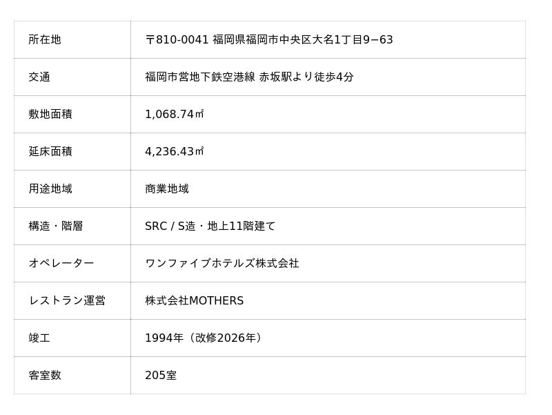 今回第6弾となる「THE KNOT FUKUOKA Tenjin」は、当社が取得した旧プラザホテル天神を全面改修しており、福岡で「HOTEL IL PALAZZO」をはじめ7ホテル(本ホテルを含む)を運営するいちごグループのワンファイブホテルズ株式会社がホテルを運営いたします。