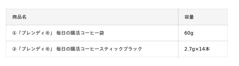 これまで、コーヒーで腸活が実践できるという日常生活への取り入れやすさとそのおいしさが高く評価され、“カラダを内側から整えたい”という生活者ニーズにお応えすることで販売も好調に推移しています※。一方で“まずは少量で自分に合っているか試したい”“外出先でも飲用したい”と感じている方も多くいらっしゃることがわかりました。 腸活に興味がある方にとって生活に気軽に取り入れやすい容量の《「ブレンディ(R)」 毎日の腸活コーヒー袋60g》を新発売します。また1杯分の計量が不要でサッと作ることができ、持ち運びにも便利な個包装タイプ〈スティックブラック14本〉は機能訴求を強化したパッケージにリニューアルし発売します。