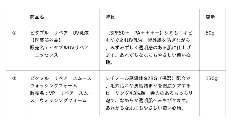 コーセーコスメポート株式会社(本社:東京都中央区、代表取締役社長:小林 孝雄)は、あらゆる肌悩み※1の原因にアプローチし、すこやかな透明美肌へ導くスキンケアブランド『VITAPURU(ビタプル)』(以下『ビタプル』)から、シミもニキビも防ぐ※4ビタミン※5(保湿)配合の「リペア UV乳液」 (1品目1品種、ノープリントプライス)【医薬部外品】とレチノール誘導体※2BG(保湿)を配合のピーリング※3洗顔「リペア スムースウォッシングフォーム」(1品目1品種、ノープリントプライス)を2026年3月19日より全国の量販店・ドラッグストアを中心に順次発売します。