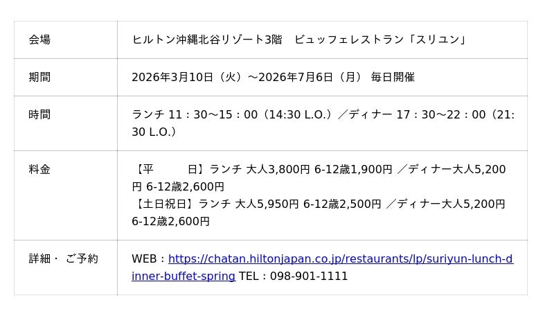 【2026年2月20日】ヒルトン沖縄北谷リゾート(北谷町(ちゃたんちょう)美浜(みはま) 統括総支配人 宍倉裕(ししくらゆたか))は、ビュッフェレストラン「スリユン」にて、2026年3月10日(火)から2026年7月6日(月)まで、『至福の海老づくしビュッフェ~五感で愉しむ贅沢エビ・セレクション~』を開催いたします。