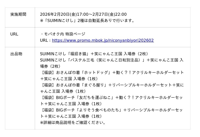 株式会社モバオク(本社:東京都渋谷区、代表取締役社長:小一原 宏樹、以下モバオク)が運営するオークションサービス「モバオク」にて、WHDC アクロディア株式会社(本社:東京都新宿区、代表取締役社長:窪田圭一)が実施する『「SUIMIN × 笑にゃん日和」チャリティーオークション』を、2026年2月20日(金)から開始いたします。