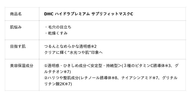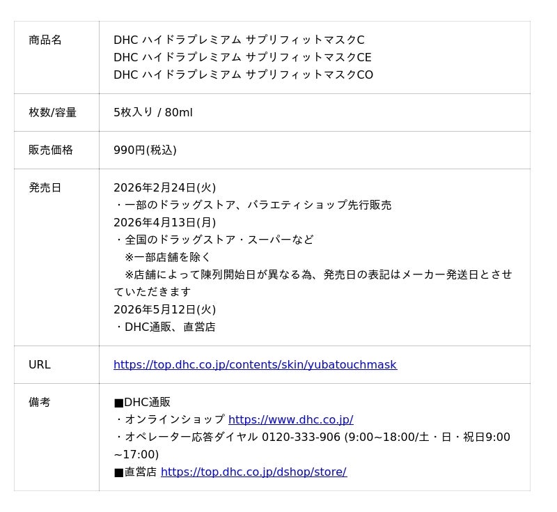 株式会社ディーエイチシー(本社:東京都港区、代表取締役社長:宮崎緑、以下:DHC)は、肌悩みに応じて選べるシートマスク「DHC ハイドラプレミアム サプリフィットマスク」を2026年2月24日(火)より順次発売いたします。肌悩みや目指す肌状態に合わせて主成分から選択するというサプリメント発想をもとに、「ビタミンC」、「セラミド」、「コラーゲン」のラインナップをご用意しました。シート感にもこだわり、まるで生湯葉のような繊細でなめらかな質感を再現し、肌と一体化するほどの密着感で美容保湿成分を角質層までしっかり届けます。