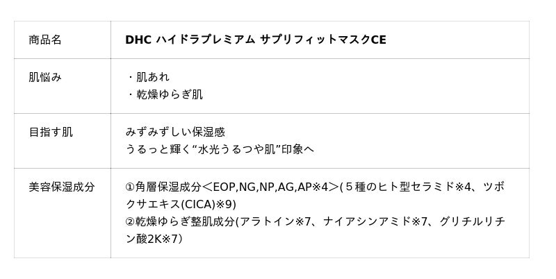 「DHCハイドラプレミアム サプリフィットマスク」は、美容保湿成分の配合設計からシート素材にいたるまで、“肌への届け方”にこだわって開発したシートマスクです。美容保湿成分には、肌悩みに応えるコア成分と、その働きを支えるサポート成分を組み合わせ、透明感※2ケアを意識した「ビタミンC※3」、肌荒れ・ゆらぎケアに着目した「セラミド※4」、ハリと弾力をサポートする「コラーゲン※5」の3つのラインナップを用意。さらに、シートと肌の間に“うるおい保水膜”を形成する独自構造により、美容保湿成分が肌に吸着するように密着。角質層まで惜しみなく届け、毎日のスキンケアに心地よいうるおいの実感をもたらします。