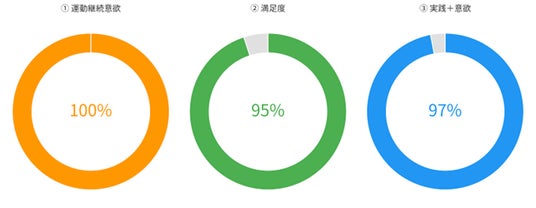 ・ 参加者の運動実践者74%、実践意欲含め97%により、教室外での運動継続が実現