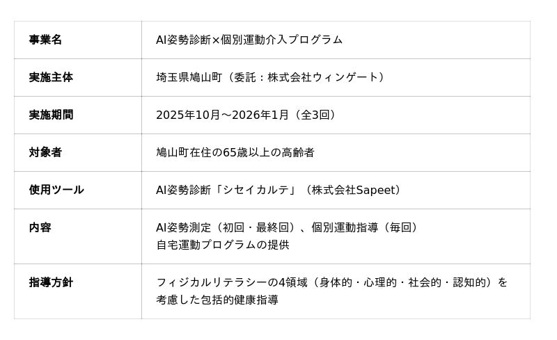 株式会社ウィンゲート(本社:東京都板橋区、代表取締役:遠山健太)は、埼玉県鳩山町と連携し、2025年度フレイル予防事業「AI姿勢診断×個別運動介入プログラム」を実施いたしました。