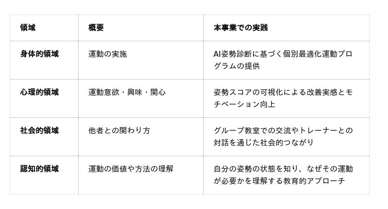 当社は、東京大学高齢社会総合研究機構(IOG)の「ジェロントロジー・ネットワーク」に参加しており、フレイル予防に関する最新の学術的知見を基盤としています。本事業の最大の特徴は、世界的に注目される「フィジカルリテラシー(Physical Literacy)」の概念を取り入れた点にあります。単なる運動指導にとどまらず、AIによる客観評価と個別最適化介入を組み合わせ、身体的・心理的・社会的・認知的の4つの領域から運動習慣の定着に包括的にアプローチする“効果検証型”フレイル予防モデルです。
