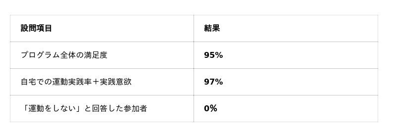 このアプローチにより、参加者は「なぜ運動するのか」「自分には何が必要か」を理解した上で運動に取り組むため、教室終了後も自宅での運動継続につながりました。「運動をしない」と回答した参加者が0%であった結果は、フィジカルリテラシーを考慮した指導の有効性を示すものと考えています。