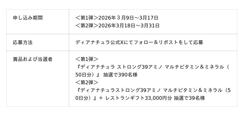 3月9日からXを活用したプレゼントキャンペーンを実施します。ディアナチュラ公式Xアカウントにてキャンペーン投稿をフォロー&リポストした方に、抽選で賞品を提供する企画を展開します。