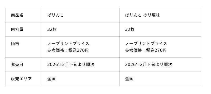 また、「ぱりんこ のり塩味」については、より本格的な味わいを求めるお声を多くいただいており、お子さまのおやつとしてはもちろん、大人の方のおやつやお酒のおつまみとしてもご満足いただける商品へリニューアルすることといたしました。