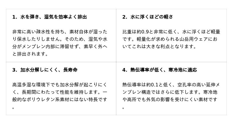 そこでミレーが次世代メンブレン素材として注目したのが、素材自体が高い疎水性を持ち、長期にわたって透湿性能を維持できるポリプロピレン(PP)です。ポリプロピレンの主な特長は以下のとおりです。