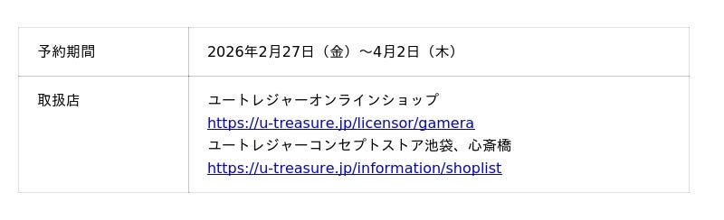 株式会社ユートレジャー(本社:東京都新宿区、代表取締役社長:青木 興一、株式会社ケイ・ウノの連結子会社)は、60周年を迎えた『ガメラ』とコラボレーションした数量限定フィギュア(全4種類)の予約受付を2026年2月27日(金)~4月2日(木)の期間、ユートレジャーオンラインショップ、ユートレジャーコンセプトストア池袋・心斎橋にて行います。