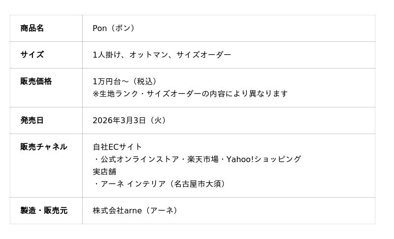 インテリア家具ブランド「arne(アーネ)」を運営する株式会社arne(本社:愛知県名古屋市中区大須、URL:https://interior-arne.com)は、2026年春の新生活シーズンに向け、1cm単位のサイズオーダーと1万円台からの低価格を両立した新作ソファ「Pon(ポン)」を2026年3月3日(火)より発売いたします。