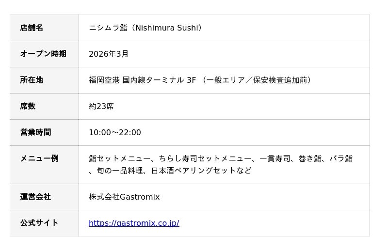 株式会社Gastromix(所在地:福岡県福岡市/代表取締役:堀池広樹)は、2026年3月20日(金・祝)、福岡空港 国内線ターミナル内に新店舗「ニシムラ鮨(Nishimura Sushi)」をオープンいたします。