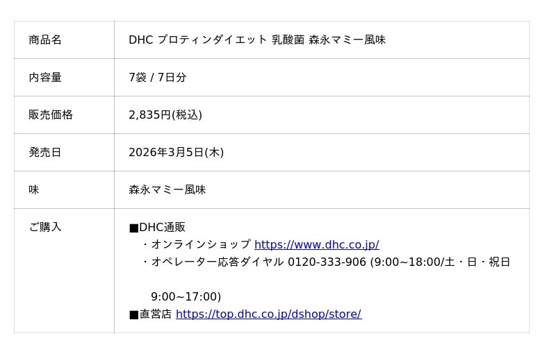株式会社ディーエイチシー(本社:東京都港区、代表取締役社長:宮崎 緑、以下:DHC)は、森永乳業株式会社(本社:東京都港区、代表取締役社長:大貫 陽一、以下:森永乳業)と協働し、長年多くの方に親しまれている甘酸っぱく、スッキリとしたやさしい味わいが特長の“森永マミー“風味の「DHC プロティンダイエット 乳酸菌 森永マミー風味」を、2026年3月5日(木)より数量限定で発売いたします。