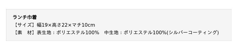 ランチ巾着は、簡易保冷素材を使用し、保冷剤を入れられるメッシュポケット付き。はっ水加工で水滴や汚れにも強く、ランチボックスがちょうど収まるサイズでカトラリーも一緒に持ち運べます。