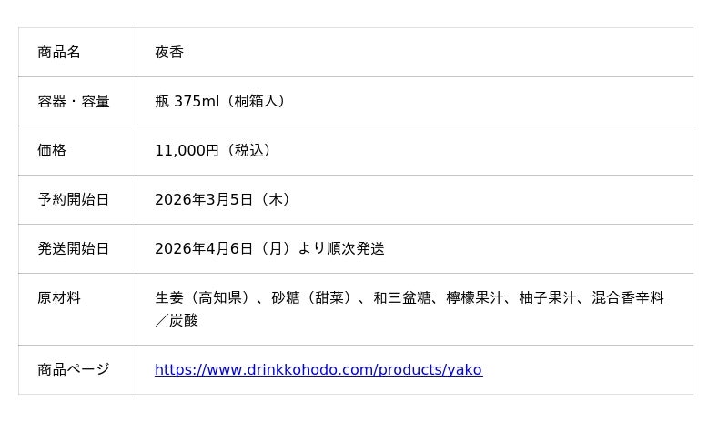 孝芳堂株式会社(本社:東京都千代田区、代表取締役社長:城垣誠朗)は、2026年3月5日(木)より、ノンアルコールのラグジュアリードリンクとして、ジンジャーエール「夜香(YAKO)」を予約販売いたします。レストランでのペアリングや、特別な食卓、大切な方へのギフトに向けた一本です。