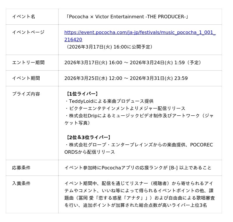 株式会社ディー・エヌ・エー(本社:東京都渋谷区、代表取締役社長兼CEO:岡村 信悟)が運営するライブコミュニケーションアプリ「Pococha(ポコチャ)」は、ビクターエンタテインメントとのコラボレーションによるアプリ内イベント「Pococha × Victor Entertainment -THE PRODUCER-」を2026年3月25日(水)~31日(火)に開催いたします。