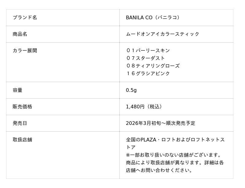 「BANILA CO」は全国のPLAZA・ロフトにて、「ムードオンアイカラースティック」を販売開始します。