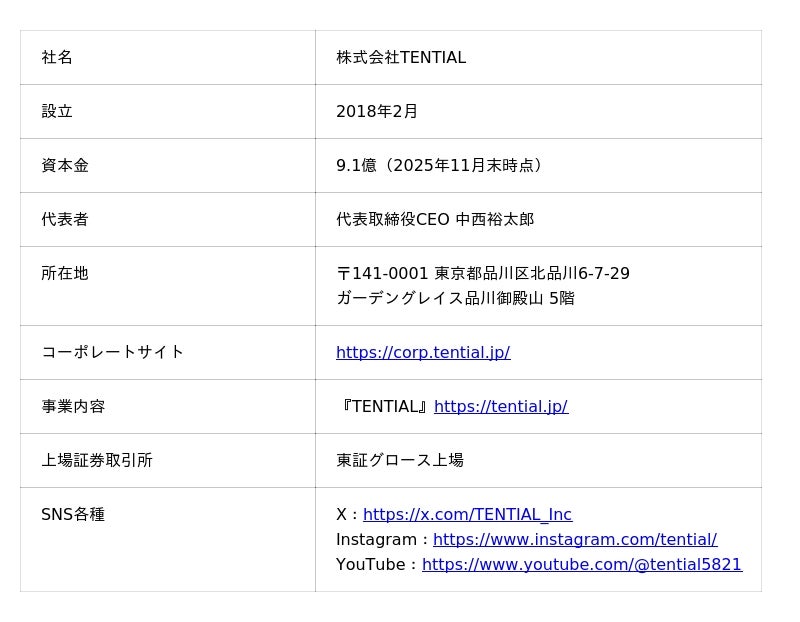 株式会社TENTIALは、「健康に前向きな社会を創り、人類のポテンシャルを引き出す。」をミッションに掲げ、コンディショニングブランド『TENTIAL』を運営しています 。代表取締役CEO中西裕太郎は、プロサッカー選手を目指した高校時代に病気で夢を絶たれた原体験から、自身のポテンシャルを最大限に発揮するためには健康と日々のコンディショニングが不可欠であると痛感。この経験から株式会社TENTIALを創業し、世の中に「コンディショニングを実装する」ことを目指しています。コンディショニングブランド『TENTIAL』は、アスリートの知見と最新技術・研究に基づき、機能性を追求した製品・サービスを提供。24時間365日、日常生活のあらゆるシーンで心身を整え、疲労回復やパフォーマンス向上をサポートするコンディショニング活動を推進しています 。すべては個人のコンディションとポテンシャルを引き出すという信念のもと、株式会社TENTIALは、健康に前向きな社会の実現のため、コンディショニングの社会実装に取り組んでまいります。