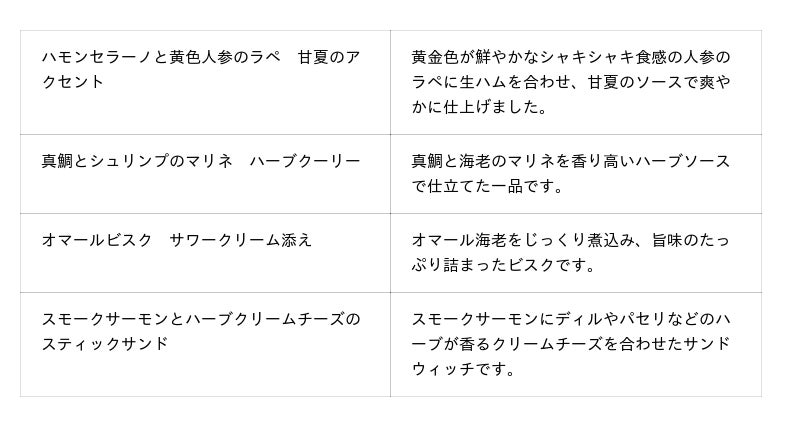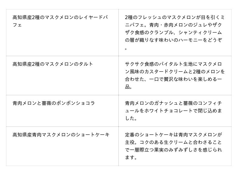 都会の中でも自然豊かな御殿山で、四季の移ろいを感じながらお楽しみいただく東京マリオットホテルのアフタヌーンティー。5月~6月は昨年多くのご好評をいただいた高知県「西島園芸団地」の当ホテル専用の畑から直送される2種のマスクメロンを主役に、味わいへのこだわりをさらに究めて再び皆様をお迎えします。青肉は上品なアロマととろける舌触り、赤肉は爽やかな香りと緻密な食感、どちらも皮際まで糖度14度以上の甘さをしっかりと楽しめるのが特長です。スイーツは、大振りにカットされた2色のメロンが目を引くパフェや青肉マスクメロンの豊かな香りと生クリームの相性をダイレクトに感じられるショートケーキなど8品をご用意。セイボリーは、ハーブが爽やかに香るスモークサーモンのサンドウィッチやオマール海老の旨味がたっぷり詰まったビスクなど、食欲そそる4品が並びます。