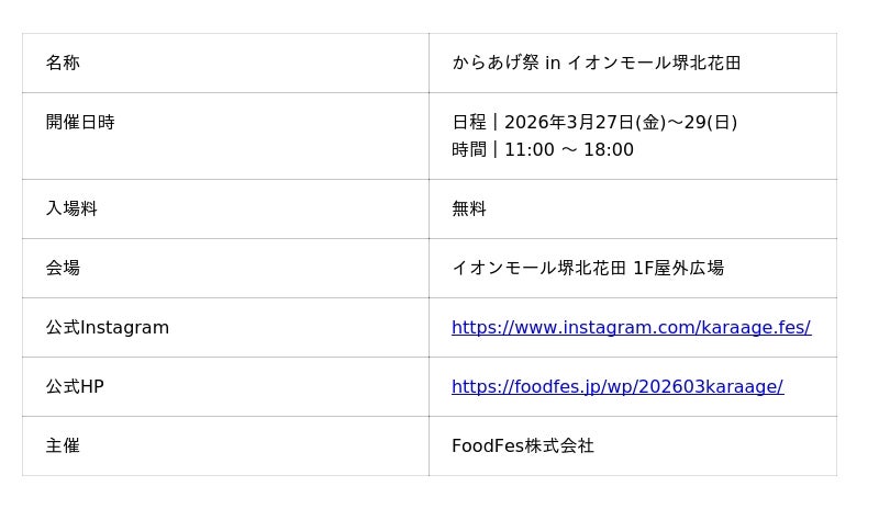 FoodFes株式会社(代表取締役:稲垣一馬)は2026年3月27日(金)~3月29日(日)3日間、「からあげ祭 in イオンモール堺北花田」をイオンモール堺北花田(大阪府堺市)にて開催いたします。