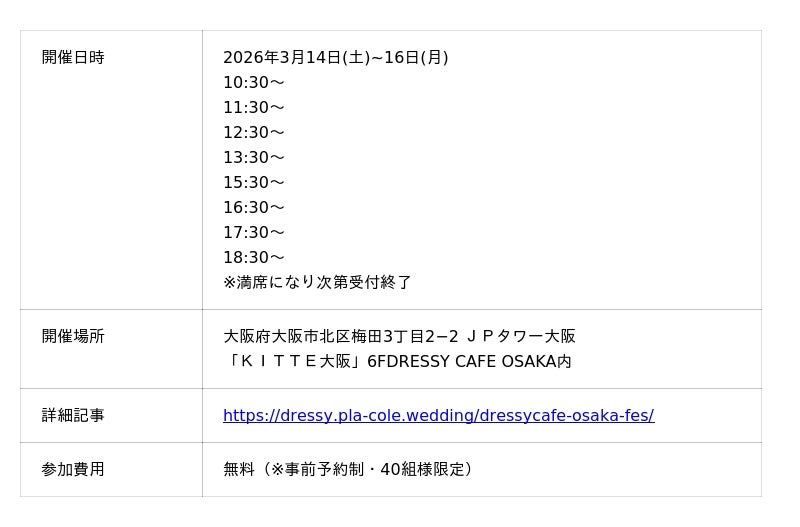 「PLACOLE & DRESSY」ブランドを展開する、冒険社プラコレ(本社:神奈川県鎌倉市、代表取締役CEO:武藤功樹)は、3/14(土)~16(月)の3日間限定で大阪駅直結商業施設KITTE大阪6F「DRESSY ROOM OSAKA」にて、これから結婚式をお考えのカップル様に向けた、個室相談やウェディングドレス試着ができる豪華特典付きのウェディング初体験フェスを開催することをお知らせいたします。