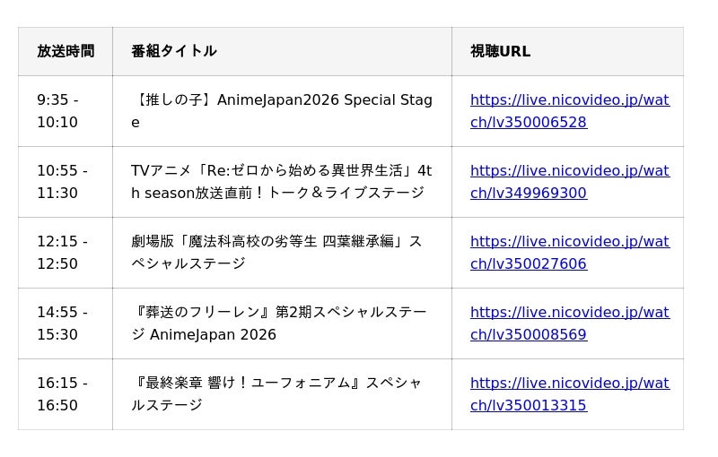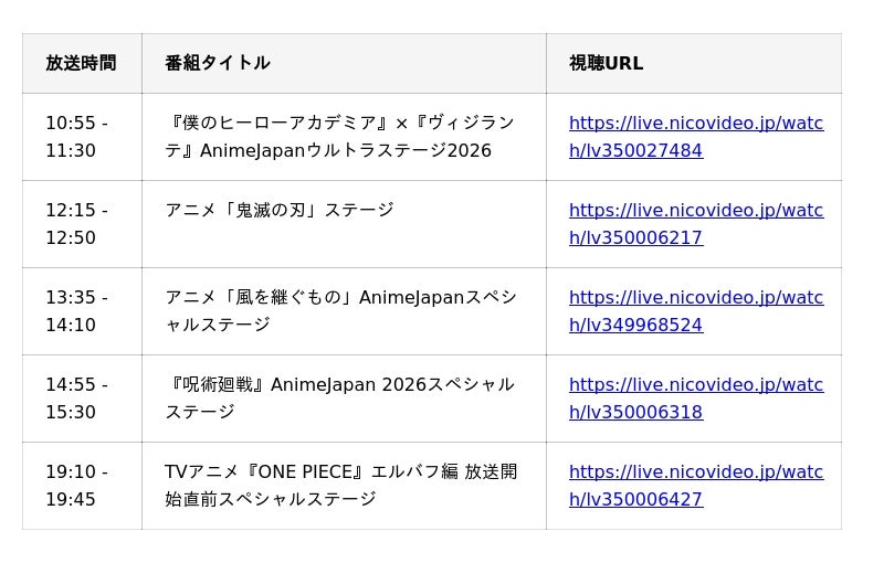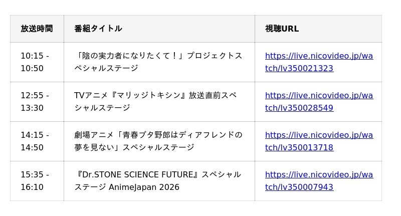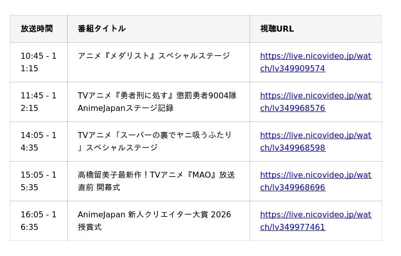 株式会社ドワンゴは、ライブ配信サービス「ニコニコ生放送」にて、2026年3月28日(土)・29日(日)に東京ビッグサイトで開催される世界最大級のアニメイベント「AnimeJapan 2026」AJステージの30プログラムを、無料生中継します。