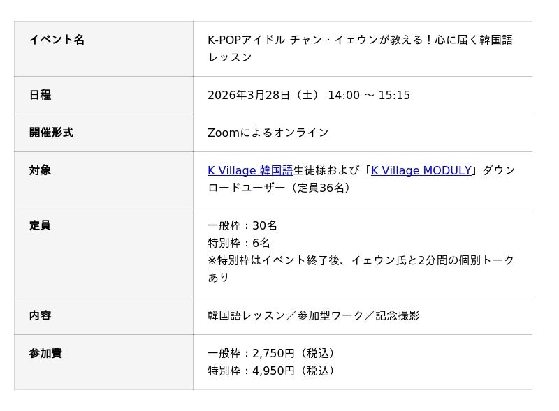本イベントは、K Villageが運営する韓国情報アプリ「K Village MODULY」のユーザーおよびK Village 韓国語の生徒様を対象とした特別レッスンです。