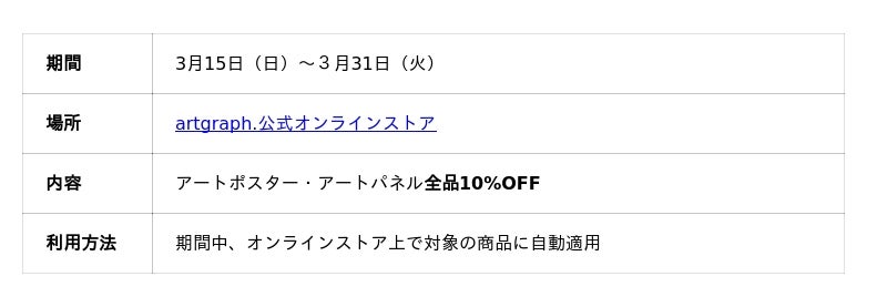 - 【新生活応援スプリングセール・第一弾】3月15日(日)~ 3月31日(火):アートポスター&パネル全品10%OFF