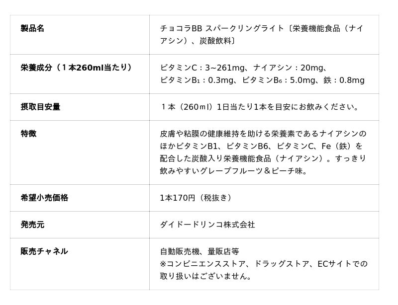 「チョコラBB スパークリングライト」は、ナイアシンのほか、ビタミンB1、ビタミンB6、ビタミンC、Fe(鉄)を配合した炭酸入りの栄養機能食品(ナイアシン)です。後味のキレが良く、すっきりとした味わいで、仕事や家事の合間のリフレッシュに適しています。また、チョコラBBシリーズとして初めて260mlペットボトルを採用し、自動販売機や一部量販店での購入シーンにフィットする設計としました。