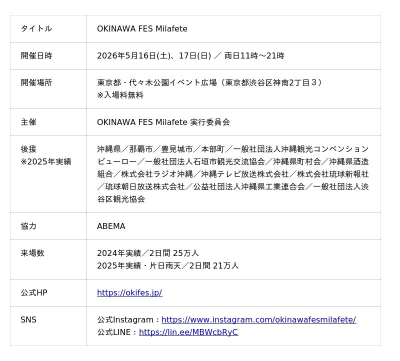 ミラフェート株式会社(所在地:沖縄県那覇市、代表取締役:笠井誉文)は、通算11回目、10周年を迎える「OKINAWA FES Milafete(オキナワフェス ミラフェート)」において、2026年5月16日(土)・17日(日)の2日間、東京都・代々木公園イベント広場にて開催される本イベント会場内に、