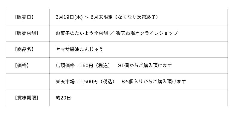 株式会社太陽社(所在地:千葉県匝瑳市飯倉293、代表取締役:片岡正裕)が展開する、千葉県で長年愛され続ける菓子店「お菓子のたいよう」は、醤油の老舗「ヤマサ醤油」との初のコラボ商品となる『ヤマサ醤油まんじゅう』を、3月19日(木)~6月末限定で再発売いたします。