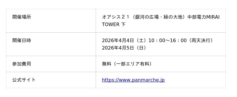 累計来場者数84万人を突破した東海地区最大級のパンイベント「パンマルシェ25」が2026年4月4日(土)・5日(日)名古屋・オアシス21にて開催されます。