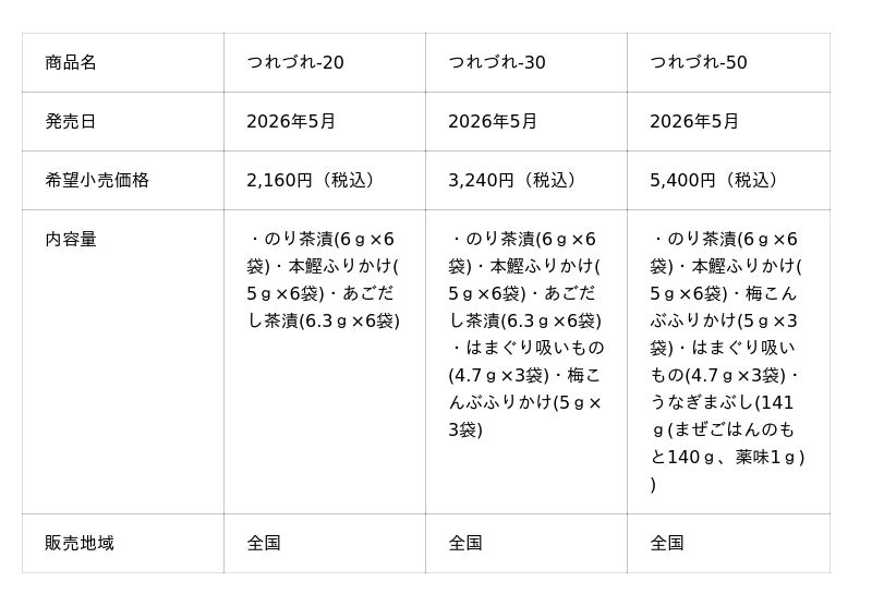のりやごま、ふりかけ、お茶漬けの素などの製造、販売を行う、株式会社浜乙女(本社:名古屋市中村区、代表取締役社長:服部義博)は、1987年の発売以来、贈答用お茶漬け・ふりかけギフトとして親しまれてきた「つれづれ」シリーズを、15年ぶりに全面リニューアルいたします。