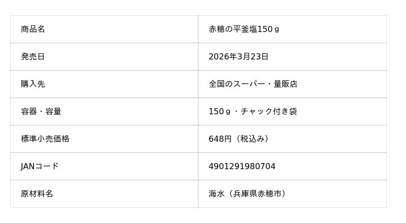 赤穂の天塩を販売する株式会社天塩(本社:東京都新宿区、代表取締役社長:鈴木 恵)は、祖業地である赤穂東浜塩田の開発から400年を迎える節目に合わせ、新商品「赤穂の平釜塩」を2026年3月23日から全国で発売します。