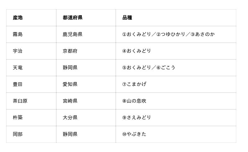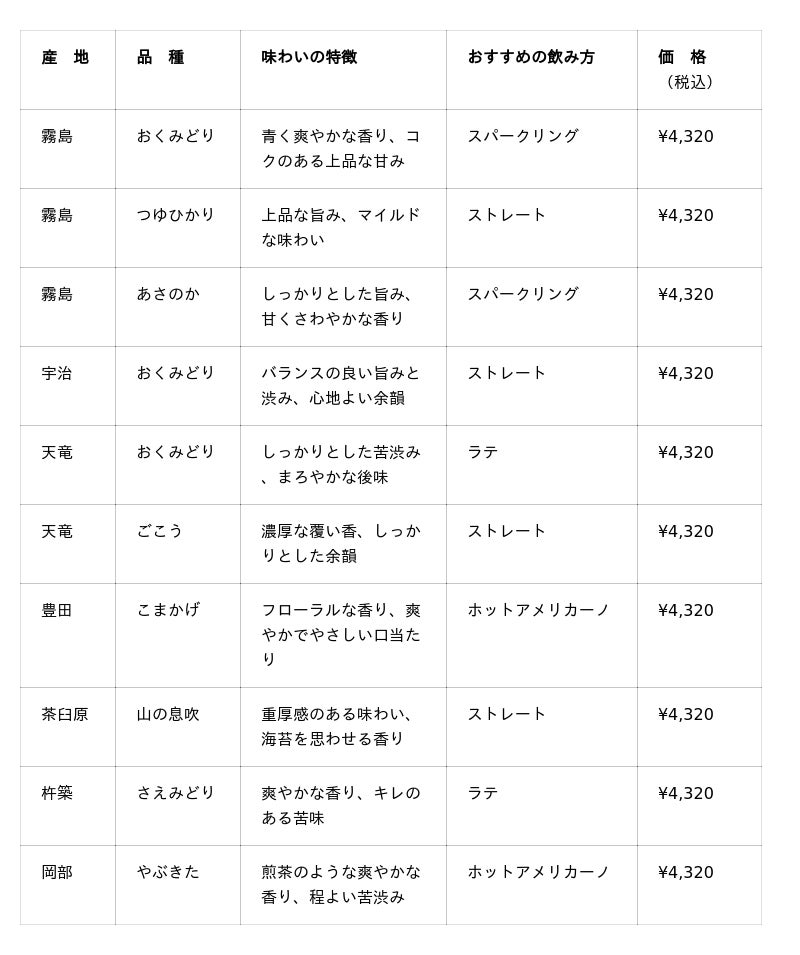 これまで7種類で展開していたシングルオリジンに、「茶臼原 山の息吹(宮崎県)」「杵築 さえみどり(大分県)」「岡部 やぶきた(静岡県)」の3種を追加し、全10種類になりました。産地や品種の違いを、これまで以上に明確にお楽しみいただけます。