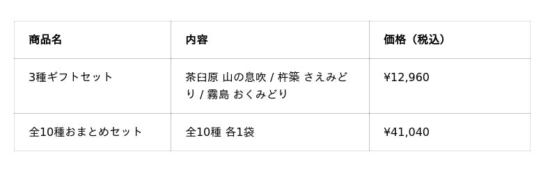 「3種ギフトセット」は、新たに加わった「茶臼原 山の息吹」「杵築 さえみどり」と一番人気の「霧島 おくみどり」を組み合わせた3種セットです。