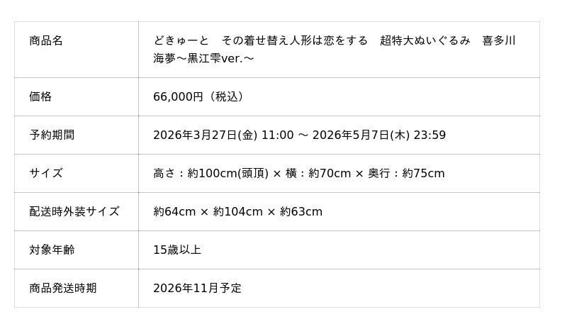 株式会社タイトー(本社:東京都新宿区、以下タイトー)は、超特大ぬいぐるみブランド「どきゅーと」の新商品として、『どきゅーと その着せ替え人形は恋をする 超特大ぬいぐるみ 喜多川海夢~黒江雫ver.~』の予約販売を実施いたします。ECサイト「TAITO GEAR&GOODS」(URL:https://taito-goods.jp/shop/default.aspx)にて、2026年3月27日(金) 11:00より予約受付を開始します。