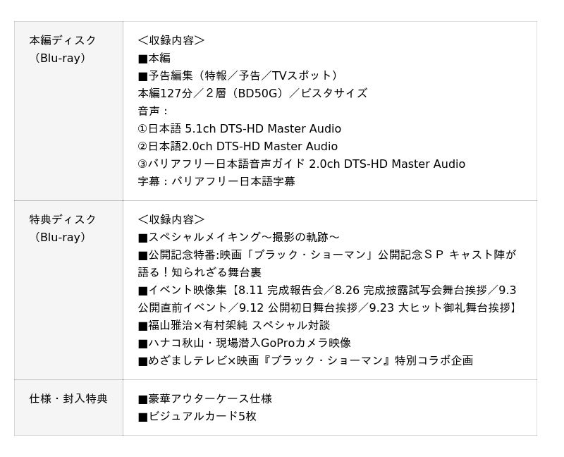 Blu-ray豪華版には映像特典として、スペシャルメイキング映像に加え、イベント映像集や福山雅治×有村架純 スペシャル対談をはじめとした宣伝映像集や公開記念特番など、映画『ブラック・ショーマン』をより楽しめる充実のコンテンツが、当初の予定を大幅に上回る5時間30分以上にも渡り収録されます。